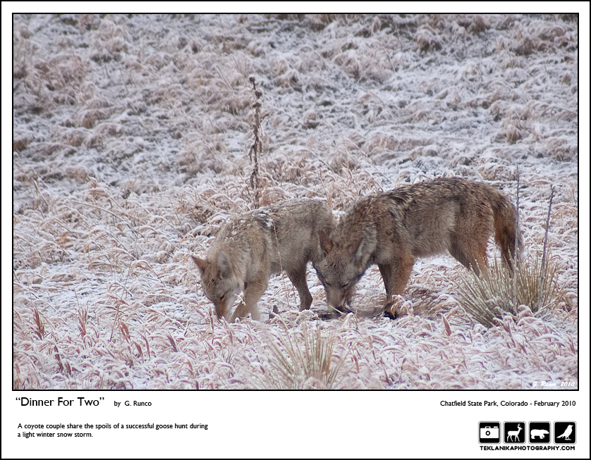 Spent the late afternoon taking pictures of mule deer at Deer Creek, then Dan and I headed to Chatfield for sunset coyotes. Found the Plum Creek’s (male and female alphas, not sure where the 2 yearlings were) at their usual spot, in sight but way out of camera range in the blowing snow, so we hit the west side of the park. Caught the beautiful Catfish Flats couple (see Valentine’s Day trip report) out in the snow. These two are excellent hunters, this is the first time I’ve ever seen coyotes succeed at hunting geese. My coyote luck seems to be getting a little better, finally – spotted 6 of them today.