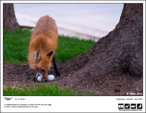 There’s a fox den across the street from my mother-in-law’s house, I’ve been staking out the den in the mornings from 6 to 7 or so. The fox mom, dad, and 2 kits have made many appearances, but I’ve yet to nail any decent shots of the family (fingers crossed for this week!). I snapped this photo of another neighborhood fox one morning as she was attempting to carry two eggs in her mouth without breaking them. It was a slow, painstaking endeavor – frequently stopping to rearrange her precious cargo, jumping several 6-foot fences and even avoiding a couple of speeding vehicles on the way back to her den, without breaking either egg.