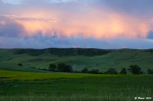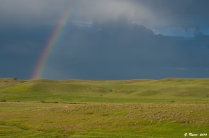 Rain, rain, rain. Nearly all of the creeks and rivers in the area are flowing over their banks, and the usually brown and tan prairies have transformed into lush, green meadows. Deer are starting to give birth to their fawns – Dan, Rob and I watched a mother deer lick her wobbly twins clean as they nursed for the first time, they couldn’t have been more than a couple of hours old. We’ve seen only one golden eaglet on the big nest at Roxy (from our ground-level angle), but judging from the way that the adults act when it’s feeding time, I don’t doubt that there’s a smaller eaglet as well. The nightly thunder storms have been great for wildlife viewing, but not great for wildlife photography – just too dark and wet.