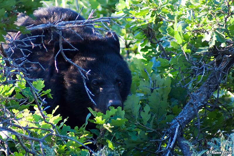 We stuck with the bear pair for the next hour or so (I ran out of disk space and Dan ran out of battery power), then made our way back to the truck. We reached the truck as my buddy Chris and his wife pulled up. Chris was anxious to see his first bears of the season, so we told him where to look and he started up the trail. After a bit of “bear talk” with Rob, Dan and I drove east to take a look in the canyon. We reached the high pullout on the east side of the park where we usually scope from, and before I could get the spotting scope out Rob was on the radio. “Another bear, upper lot again!” This bear was extremely skittish – it had darted through the parking lot and attempted to scramble up a tree near Rob’s vehicle, but fell out about half way up. The reddish-cinnamon bear finally settled down a bit when it hit the brush line on the other side of the road, following the path that the other bears had taken, sniffing the ground for the scent trail as it walked along. Dan, Rob, Chris’ wife (sorry, I’m not very good at remembering names) and I watched the bear for a couple of minutes, then Chris came around the corner on the trail – just in time to see the third bear as it ran past. The light was gone, so we decided to call it a day.