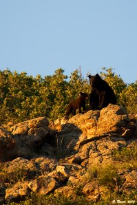 At sunset a female bear and cinnamon cub appeared on the top of the ridge above us, obviously very interested in the black bear we were photographing. She stood on her hind legs for a better view as the cub rambled around the rocks at her feet. First cub of the year, hopefully we’ll have more time with it in the future. The light was gone, so we headed back to the truck. Another 3-bear day, and these were three bears that we’d never seen before, bringing our running total to 7 individuals in the park so far this year – another day in parkadise!