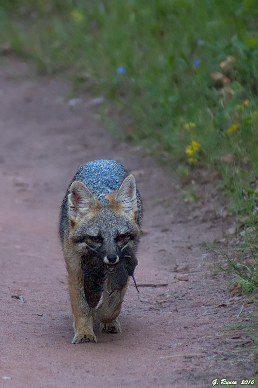 Pretty quiet day in the field. The golden eaglet is so big now, it eats like a horse when mom brings dinner to the nest and cries for more between every bite – what an insatiable appetite! As I was hiking the Willow Creek trail with my buddy Jay and his family, a gray fox came trotting toward us with three rodents in its mouth. I recognized the fox from our first encounter on the 13th (due to the missing piece of its right ear), looks to be a mother rearing her young kits, hopefully I can get a glimpse of the little ones soon.