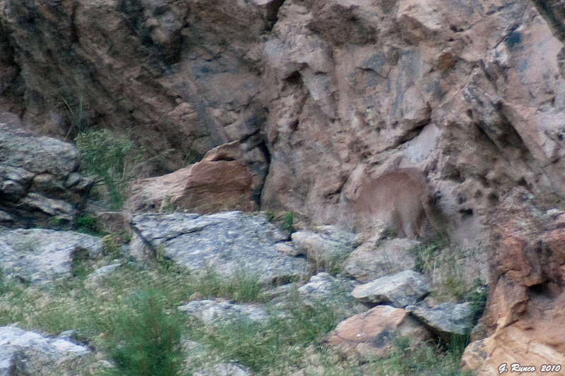 I was about to hop into the truck and leave the park when a couple of guys that I’d shared a bear sighting with last week pulled up and let me know that a lion had just crossed the road right in front of them in the canyon. Rob and I got there just in time to watch the lion climbing the canyon for a couple of minutes – it had crossed the road from south to north, most definitely the lion that we had seen earlier from so far away (Rob had snapped a couple of shots from some distance earlier, after close scrutiny we could see that it was a lion). By then it was too dark for my camera to get anything worthwhile, Rob’s camera handled it much better and he walked away with at least one decent shot – here’s the best one I got.
