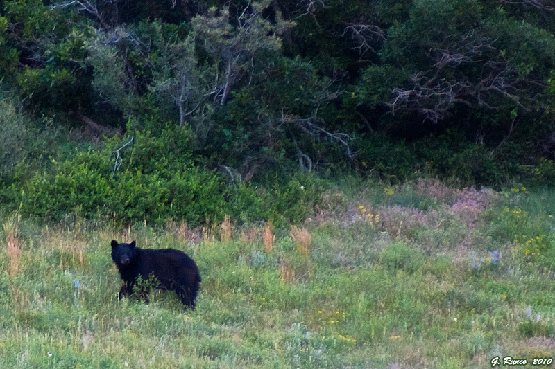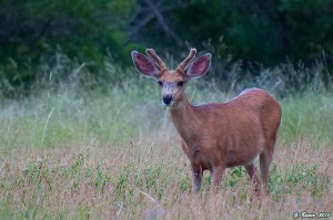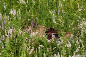 Too busy for detailed daily reports lately, so I’ll summarize the past few days. Deer fawns are growing fast, as is the golden eaglet on the canyon nest. The wildflowers are in full bloom, and all of the meadows are blanketed with vivid color. I’ve been seeing a pair of great horned owls, presumably fledglings, at the Sharptail Ridge trailhead nearly every night on my way home. A couple of sporadic bear sightings in the past couple of days, but for the most part bear action has slowed down for now – I’m betting it will pick back up once the berries start appearing on the bushes. Spotted a couple of bull elk at dusk on Friday at the south end of the Fountain Valley, never seen elk there before so that was a rare treat for me. Speaking of rare treats, a lion took down a mule deer doe very near the road on the 4th, and after waiting until dusk, a handful of die-hards were able to see the cougar make his way down to the carcass. No shots to speak of due to the fading light, but still very cool to watch – my third mountain lion sighting this summer! Dan reported that the lion wasn’t seen again on Monday, but a red fox enjoyed some of the deer during the day and a big black bear came down to the carcass and fed at sunset. There seems to be a good portion of meat left, so there could be more of this story still unfolding on Tuesday.
