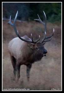 Suddenly two “bushes” to my right stand up and become bull elk, and each of them respond with their own unique rutting call. The big bull herds his harem into the open, circling the cows and calves and chasing stragglers back into the center of the group. Young spike bulls hover around the outskirts of the herd, nervously bugling and then running away as soon as the dominant bull approaches. Satellite bulls, usually 3, 4 or 5 pointers, circle the group and attempt to lure cows away from the herd. One satellite bull gets too close to the ladies, and the big guy chases him far to the south. Two other satellites seize the opportunity and rush in on the herd, scattering the group in every direction. A cow and two calves run right past me and into the timber, followed by a bugling 4 point bull with broken brow tines. I can hear them crashing around right behind me, but I can’t turn around. Even the slightest movement might give away my location and ruin my chances of getting the shots of the big bull that I want. A cow runs right up to me, stops, tilts her head as she stares at me, then runs off – the light is getting better. The herd bull has now returned, and is furiously bellowing and running in circles as he tries to get the cows herded again. A calf gets in front of the bull and the big guy lowers his head, ramming the calf with his antlers and tossing it out of the way. The calf slowly gets up and limps back to the safety of the herd. The satellite bull in the trees behind me is bugling and breaking branches, and it’s beginning to get the harem bull’s attention. The big guy bugles and grunts a couple of times, and when the smaller bull bugles back, the dominant bull heads in my direction at full speed. I scoot to my left against a tree, and the big guy stops in his tracks, about 15 feet away, staring at me. He bugles and lowers his head, and the cow and calf shoot out of the pines to my right, followed by the satellite bull. The big bull lifts his head and bugles.