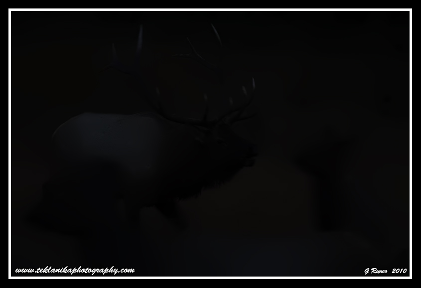 5:30 A.M. It’s almost completely dark, I can’t see anything around me but my breath in the 25 degree morning air. The sound of a distant elk bugling and breaking branches with his antlers is coming from the west. The frosty grass crunches under my feet as I slowly make my way across the open meadow toward a small pine grove. I’m trying to control my shivering, but the cold is biting at me through my layers of clothing – the first couple of minutes out of the truck are always the hardest. My eyes are beginning to adjust to the low light level. I can almost make out the fallen timber that snags my boots as I fumble around among the pines. I’m trying to be as quiet as possible, but I feel like a bull in a china shop. Finally reaching the edge of the trees, I wipe the frost off of a big fallen log and sit down. Silence. The light is getting a little better now, and I can just make out the faint outline of bushes and trees around me. I set up my tripod and camera and begin scanning the grasses and pines, listening and looking for movement mostly, because shapes can be very deceiving in this light. On a similar morning recently, an attempt to photograph a lone bull moose in a bushy bog had somehow transformed into a lone photographer sitting under the only bush in an otherwise barren bog surrounded by several moose as the light improved. The stillness is interrupted by the sound of cracking timber under hooves, elk in the pines to the west are on the move. A nearby bugle fills the air, and shapes explode out of the trees and into the meadow in front of me. A group of cow and calf elk spills out into the grass, and a big bull stomps out of the trees and lets out a long bugle.