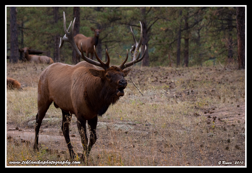 “As Autumn approaches, elk descend from the high country to montane meadows for the annual breeding season. Within the gathering herds, the larger antlered males, weighing up to 1100 pounds and standing five feet at the shoulder, move nervously among the bands of smaller females.