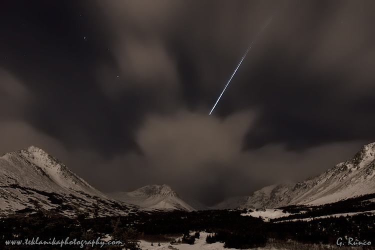 Clouds float across the night sky above the Chugach mountains as a plane flies overhead.