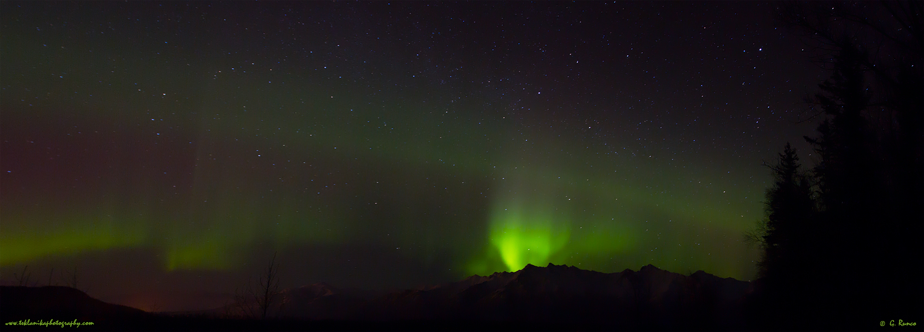 “Saturday Night Lights” © Teklanika Photography 2015 Aurora Borealis or Northern Lights Southcentral Alaska Canon 7D Canon 17-40mm lens @ 17mm 30 sec @ f4.5 iso 800 *2-photo stitched panorama © Teklanika Photography 2015