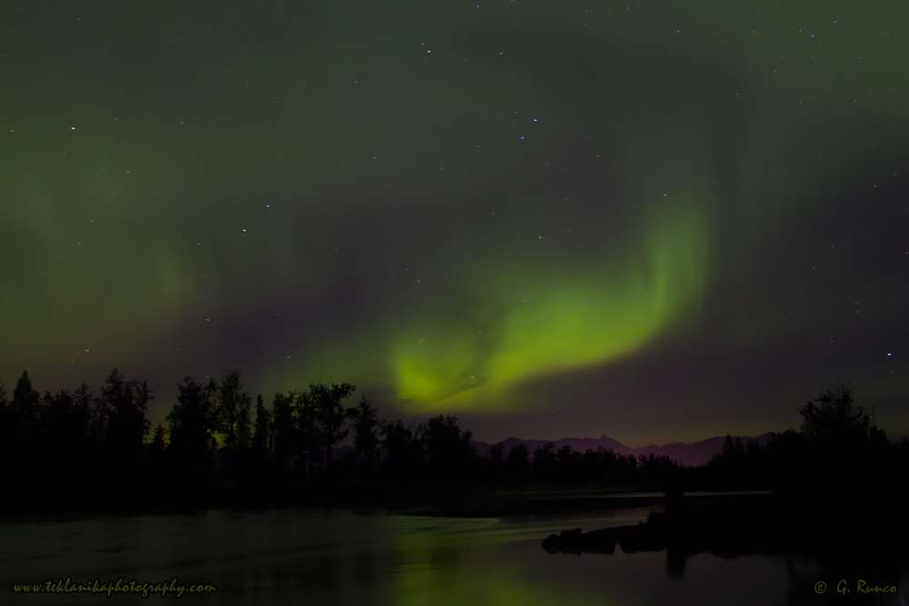“Lights over Knik River” © Teklanika Photography 2015 Aurora Borealis or Northern Lights Matanuska Valley, Alaska Canon 7D Canon 10-22mm lens @ 10mm 30 sec @ f3.5 iso 800 © Teklanika Photography 2015