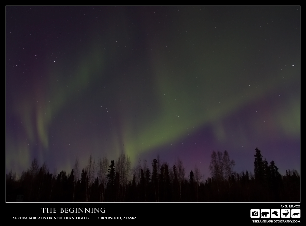 The Beginning Aurora Borealis or Northern Lights Birchwood, Alaska Canon 7D Canon 17-40mm lens @ 17mm 15 sec @ f4 iso 500 © G. Runco / Teklanika Photography 2016