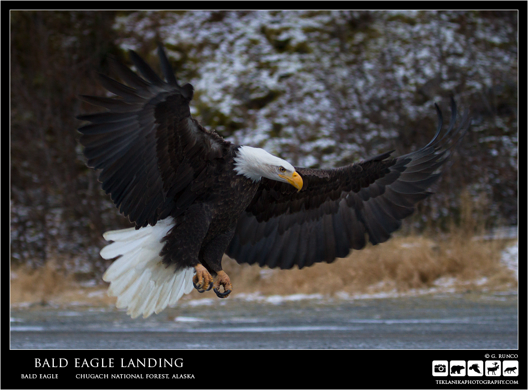 Bald Eagle Landing Bald Eagle (Haliaeetus leucocephalus) Chugach National Forest, Alaska Canon 7D w/ Canon 100-400mm lens @ 120mm 1/320 sec @ f4.5 iso 640 © G. Runco / Teklanika Photography 2016