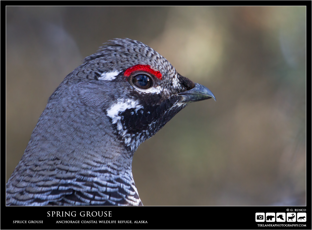 Spring Grouse Spruce Grouse (Falcipennis canadensis) Anchorage Coastal Wildlife Refuge, Alaska Canon 7D w/ Canon 100-400mm lens @ 350mm 1/160 sec @ f5.6 iso 500 © G. Runco / Teklanika Photography 2017