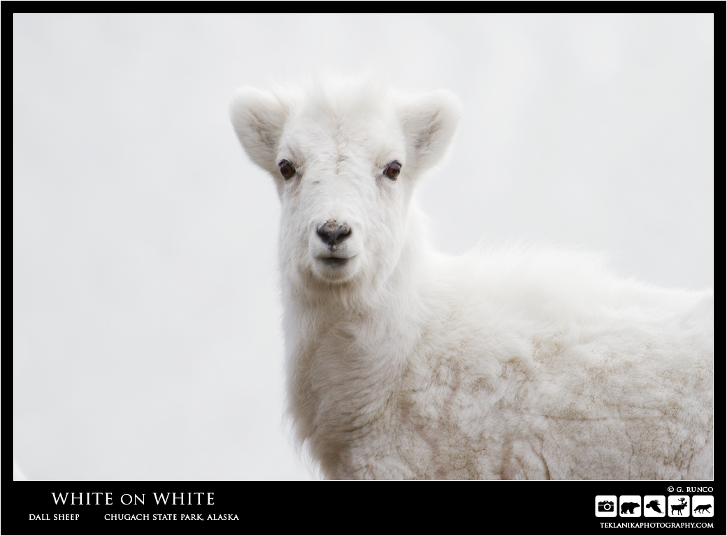 White on White Dall Sheep (Ovis dalli dalli) Chugach State Park, Alaska Canon 7D w/ Canon 100-400mm lens @ 400mm 1/400 sec @ f5.6 iso 200 © G. Runco / Teklanika Photography 2017