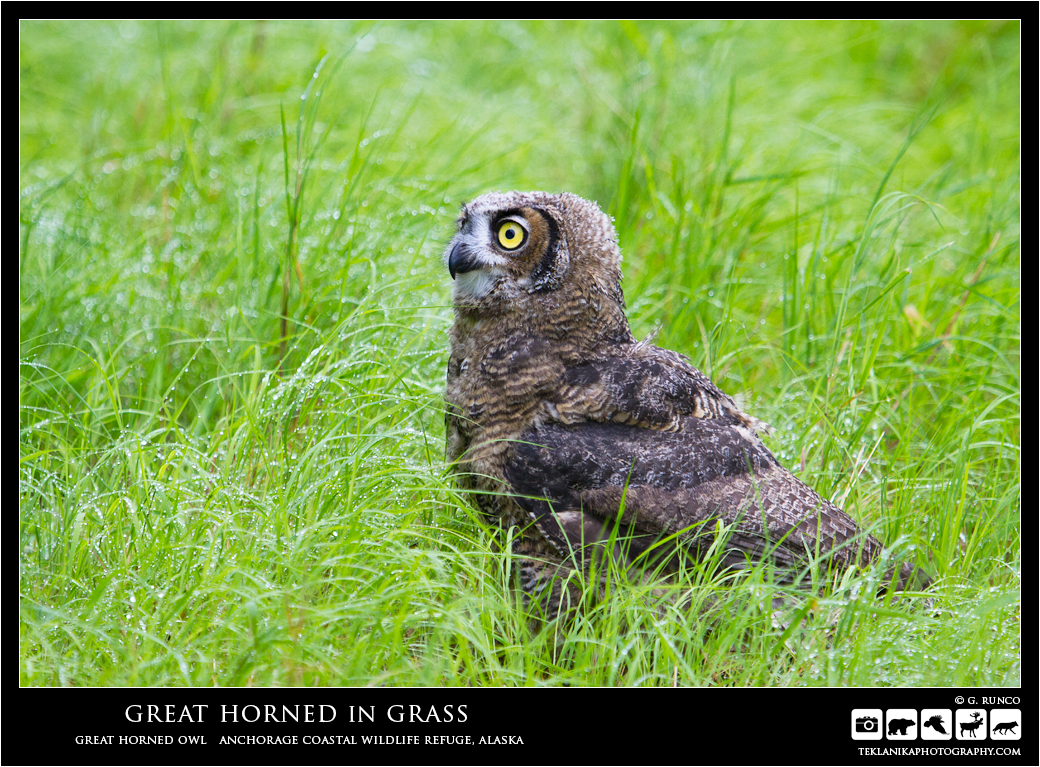 Great Horned in Grass Northwestern Great Horned Owl (Bubo virginianus lagophonus) Anchorage Coastal Wildlife Refuge, Alaska Canon 7D w/ Canon 100-400mm lens @ 285mm 1/250 sec @ f5.6 iso 400 © G. Runco / Teklanika Photography 2015
