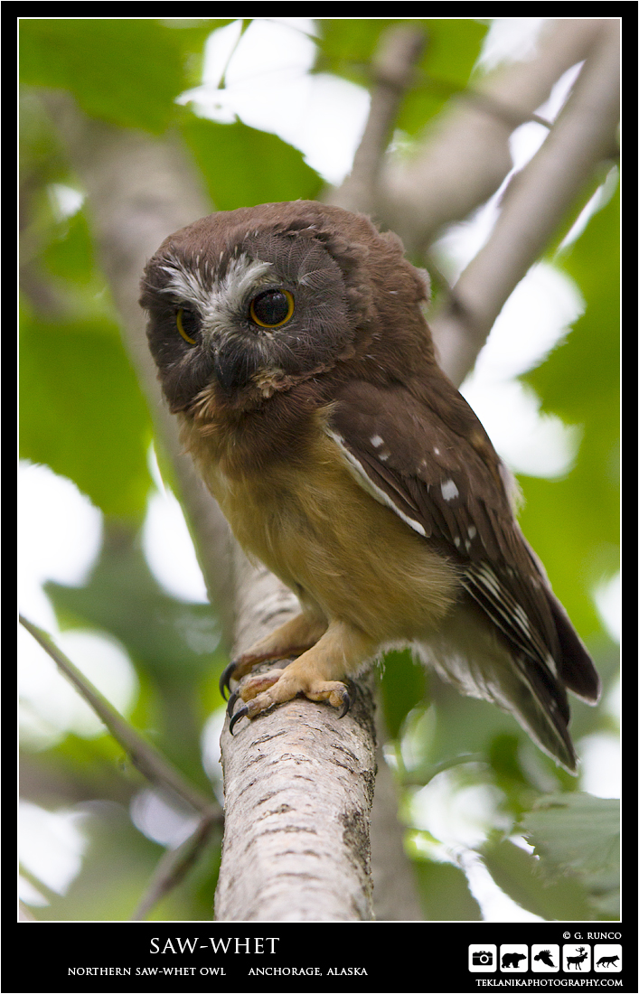 Saw-whet Northern Saw-whet Owl (Aegolius acadicus) Anchorage, Alaska Canon 7D w/ Canon 100-400mm lens @ 235mm 1/125 sec @ f5.6 iso 400 © G. Runco / Teklanika Photography 2015