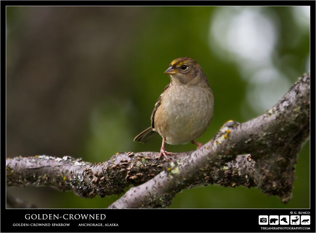 Golden-crowned Golden-crowned Sparrow (Zonotrichia atricapilla) Anchorage, Alaska Canon 7D w/ Canon 100-400mm lens @ 400mm 1/100 sec @ f5.6 iso 500 © G. Runco / Teklanika Photography 2017