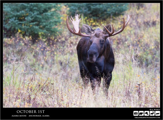 October 1st Alaska Moose (Alces alces gigas) Anchorage, Alaska Canon 7D w/ Canon 100-400mm lens @ 250mm 1/60 sec @ f5 iso 500 © G. Runco / Teklanika Photography 2017