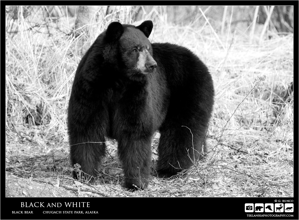 Black and White Black Bear (Ursus americanus) Chugach State Park, Alaska Canon 7D w/ Canon 100-400mm lens @ 190mm 1/125 sec @ f5 iso 500 © G. Runco / Teklanika Photography 2017