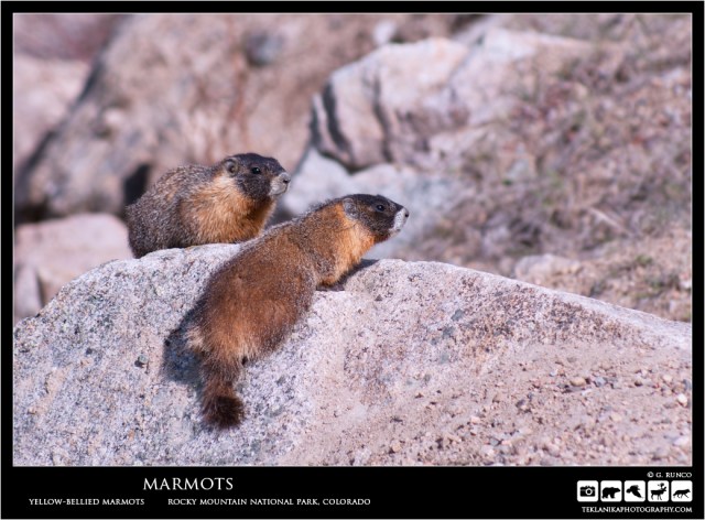 Marmots Yellow-bellied Marmots (Marmota flaviventris) Arapaho National Forest, Colorado Sony A200 w/ Sony 75-300mm lens @ 300mm 1/800 sec @ f8 iso 100 © G. Runco / Teklanika Photography 2017
