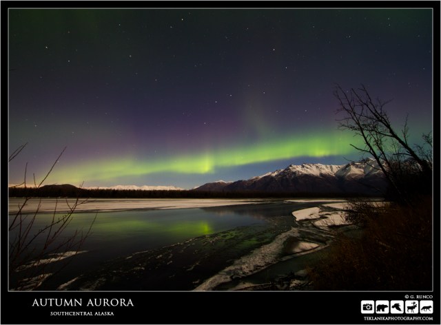 Autumn Aurora Aurora Borealis or Northern Lights Southcentral Alaska Canon 7D w/ Canon 10-22mm lens @ 10mm 30 sec @ f3.5 iso 500 © G. Runco / Teklanika Photography 2017